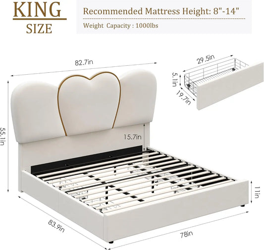 King LED Bed Frame with 4 Storage Drawers, Velvet with 55" Tall Heart Shaped Headboard