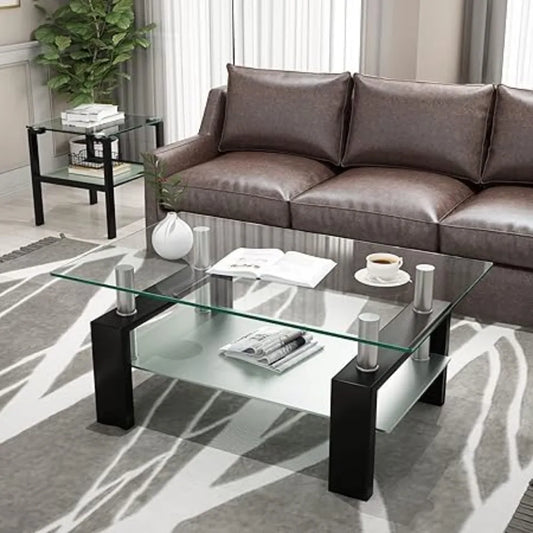 Rectangle Glass Coffee Table 2-Tier Tea Table Modern Side Coffee Table